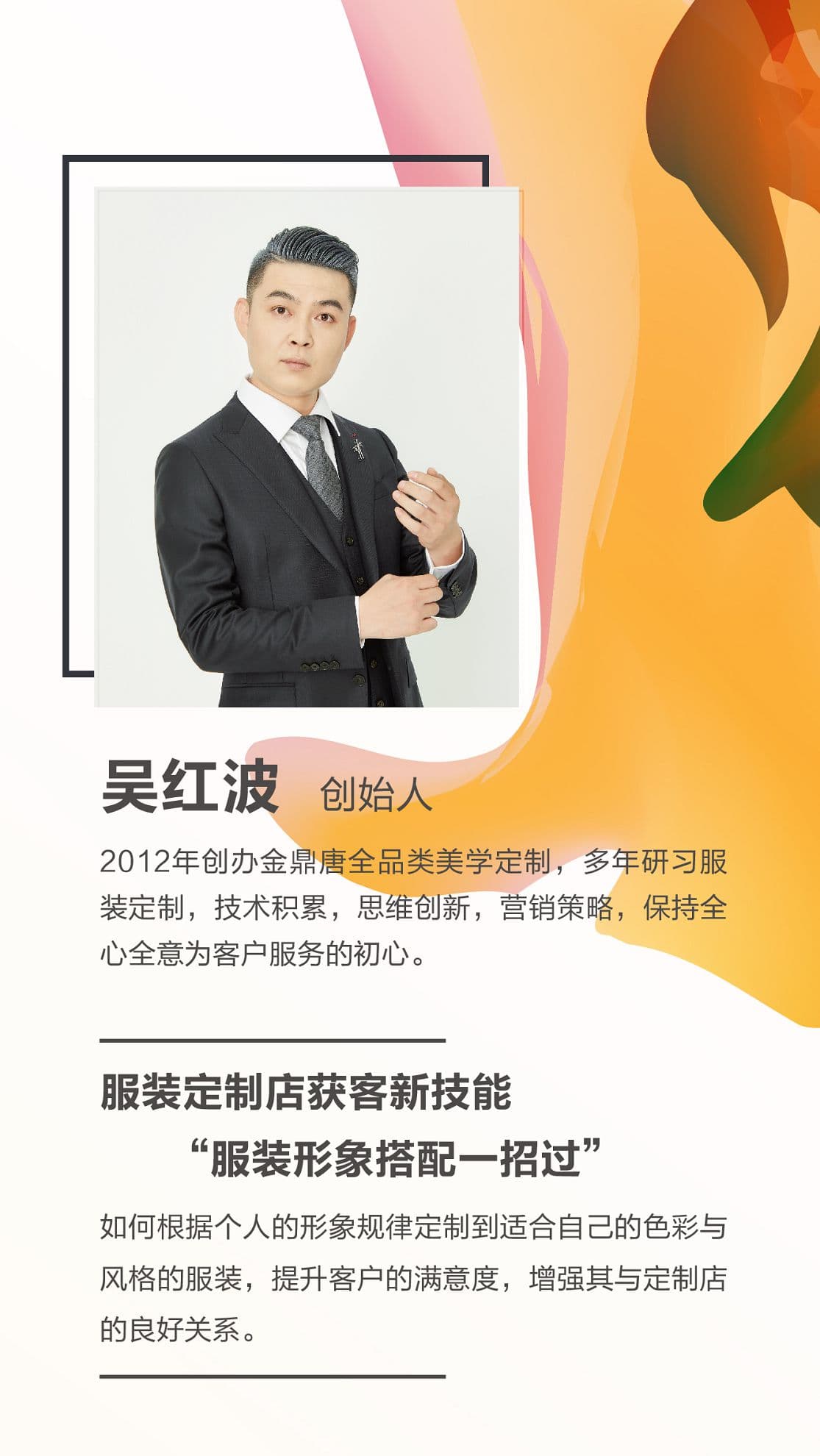 金鼎唐全品類美學(xué)定制創(chuàng)始人吳紅波先生將分享定制店獲客至寶:服裝搭配技巧